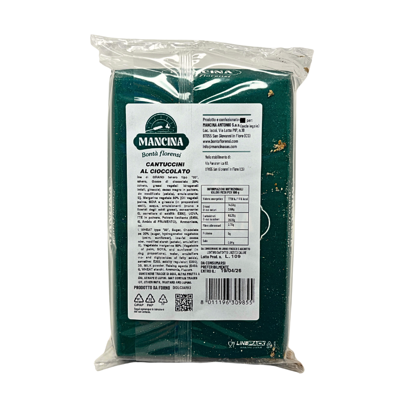 I Cantuccini al Cioccolato Mancina rappresentano una gustosa rivisitazione del classico biscotto della tradizione dolciaria calabrese, noto per la sua croccantezza e genuinità. Preparati secondo ricette artigianali tramandate nel tempo, questi cantuccini uniscono la fragranza dell’impasto dorato al sapore intenso del cioccolato fondente, creando un equilibrio perfetto tra dolcezza e carattere. Originariamente nati come dolci da forno da conservare a lungo, venivano preparati in occasione delle festività e condivisi in famiglia o con gli ospiti come gesto di accoglienza. I Cantuccini Mancina celebrano questa tradizione con un tocco moderno e irresistibile: ideali da gustare con un bicchiere di vino dolce o liquore al caffè, oppure con una tazza di latte o cappuccino, per una pausa che racchiude tutto il piacere autentico e genuino della Calabria.