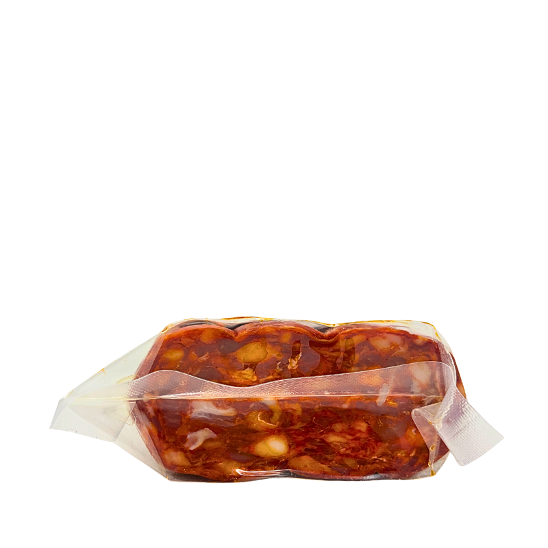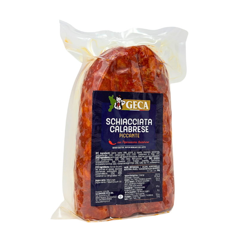 La Schiacciata Calabrese Piccante è un salume che incarna tutta la forza e il carattere della tradizione gastronomica calabrese. Nata dalla lavorazione artigianale di carne suina selezionata, viene arricchita con il celebre peperoncino calabrese, simbolo della cucina del Sud, che le dona il suo colore rosso vivo e il gusto inconfondibile. La sua forma schiacciata, tipica delle zone interne della regione, favorisce una stagionatura uniforme e una consistenza compatta ma morbida al taglio. Il profumo è intenso, il sapore deciso e avvolgente, con un equilibrio perfetto tra dolcezza della carne e piccantezza speziata. Ideale da gustare a fette su pane casereccio, accompagnata da formaggi e vini rossi robusti, oppure come ingrediente per pizze, focacce o sughi dal sapore autentico. Ogni morso racconta la Calabria: terra di sole, passione e tradizioni tramandate con orgoglio.