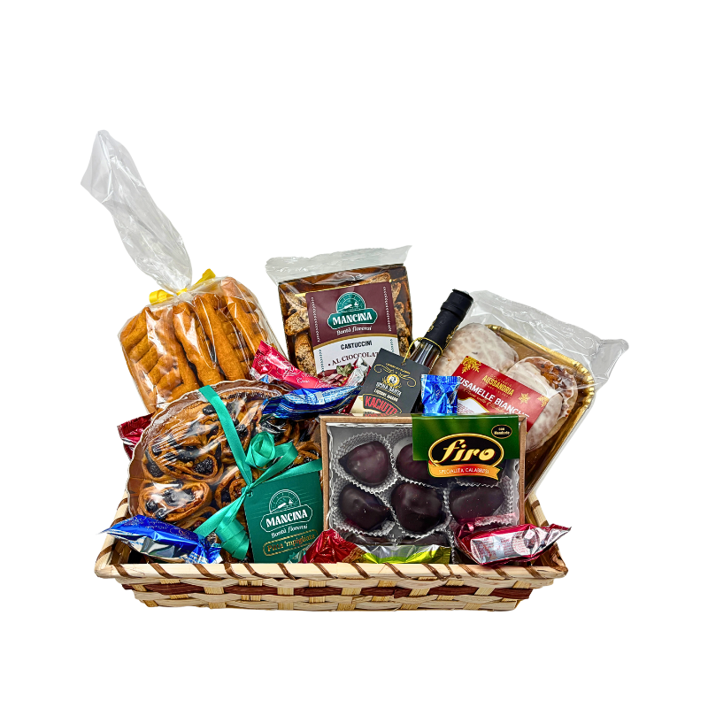 A rendere il cesto ancora più prezioso ci sono i raffinatissimi Firo, piccoli scrigni di gusto ripieni e ricoperti da finissimo cioccolato, veri ambasciatori della dolcezza calabrese moderna. Completano la selezione una bottiglia di liquore tipico e una varietà di dolcetti confezionati, ideali da condividere o da gustare lentamente.
