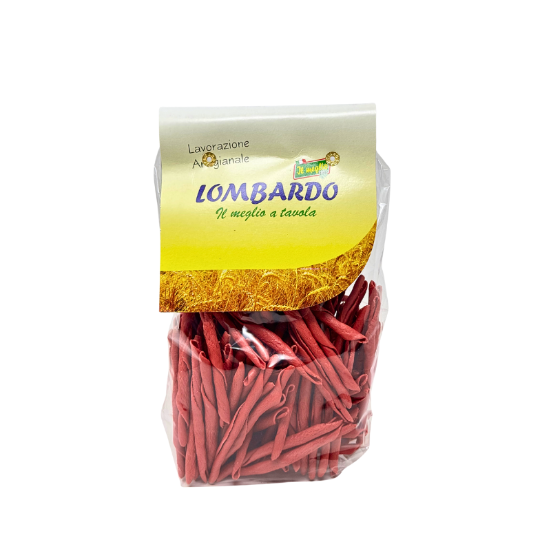Le Fileja alla Cipolla Rossa di Tropea IGP Lombardo rappresentano una perfetta fusione tra la tradizione artigianale calabrese e l’autenticità dei sapori del territorio. Realizzate con semola di grano duro di alta qualità e trafilate al bronzo, si distinguono per la loro consistenza porosa che trattiene al meglio ogni condimento. L’aggiunta della Cipolla Rossa di Tropea IGP, celebre per il suo gusto dolce e aromatico, dona alla pasta un delicato colore rosato e un profumo inconfondibile che racconta la Calabria più genuina.