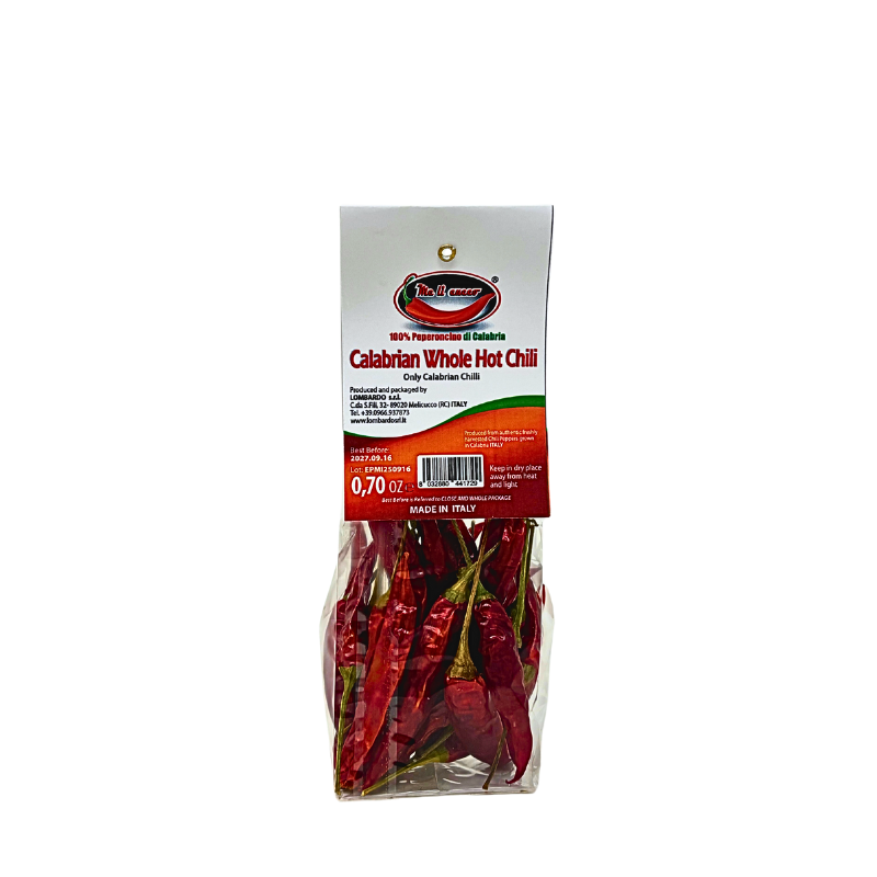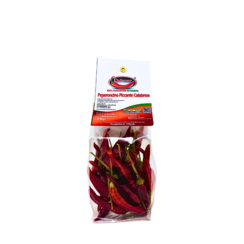 Essiccato naturalmente per preservarne il colore vivo e il profumo intenso, il peperoncino calabrese sprigiona un gusto deciso, ardente e persistente, capace di esaltare ogni piatto.
