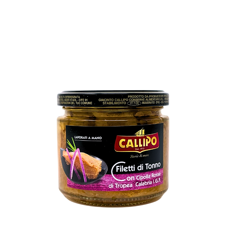 I Filetti di Tonno Callipo con Cipolla Rossa di Tropea Calabria I.G.P. racchiudono in ogni boccone l’essenza della tradizione calabrese, dove mare e terra si incontrano in un equilibrio perfetto di sapori. Callipo, storica azienda fondata nel 1913 a Pizzo, è sinonimo di eccellenza e qualità artigianale, con filetti di tonno lavorati a mano e conservati in olio per preservarne gusto e morbidezza.
