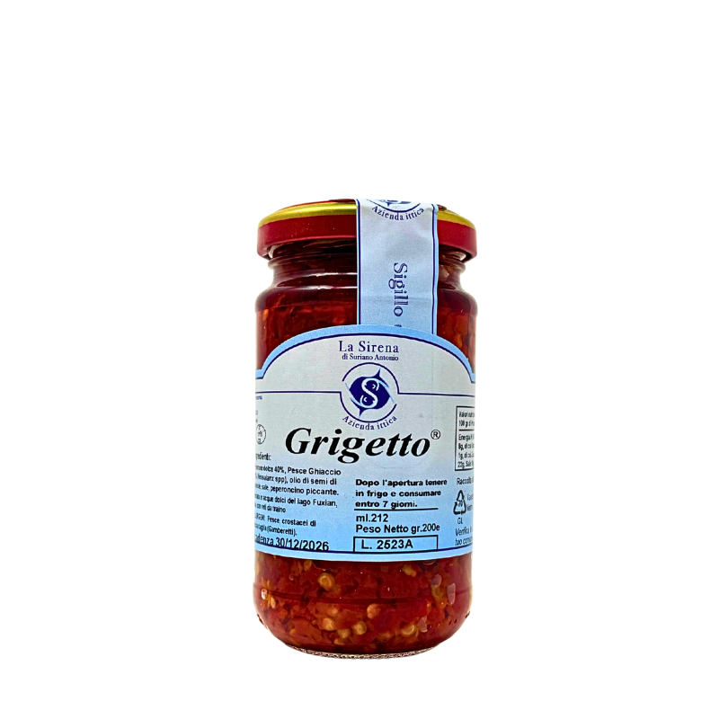 Il Grigetto La Sirena è un’eccellenza calabrese che racchiude tutta la vivacità e il carattere del Sud. Nasce dall’incontro tra il pregiato pesce ghiaccio e il peperoncino piccante calabrese, due ingredienti simbolo di una terra generosa e autentica. Preparato secondo la tradizione marinara locale, il Grigetto rappresenta una conserva dal gusto deciso, che unisce il sapore delicato del pesce alla forza speziata del peperoncino.