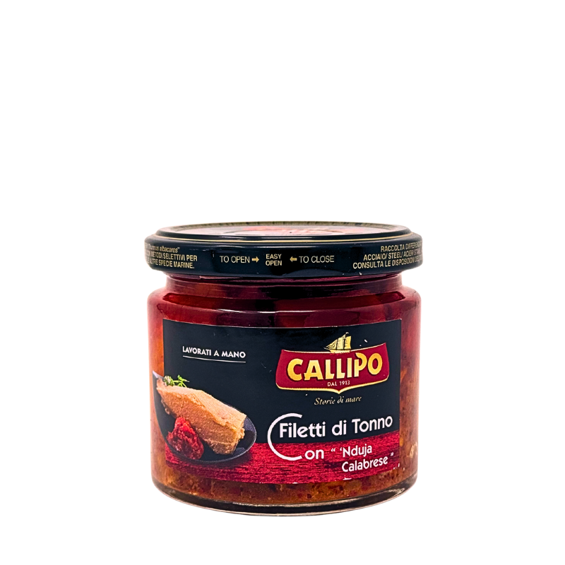 I Filetti di Tonno Callipo con ’Nduja Calabrese rappresentano un connubio perfetto tra mare e terra, due simboli autentici della Calabria. Il tonno Callipo, selezionato e lavorato a mano secondo tradizione, incontra la ’nduja, il celebre salume spalmabile dal carattere deciso e piccante, tipico dell’area di Spilinga.