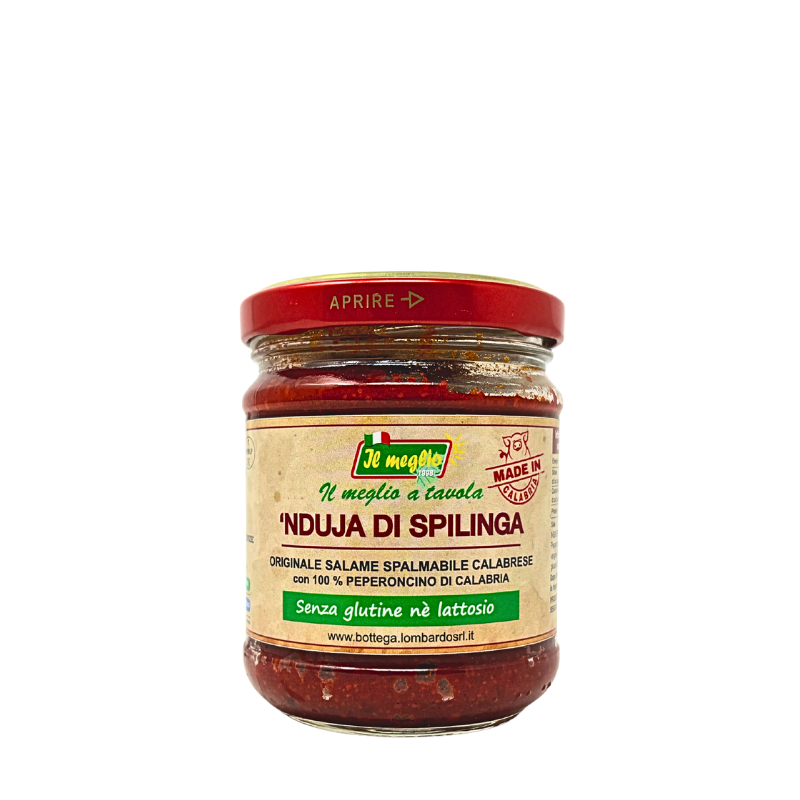 La ’Nduja di Spilinga è il simbolo per eccellenza della tradizione gastronomica calabrese, una specialità unica al mondo per il suo carattere deciso e il suo sapore inconfondibile. Originaria del piccolo borgo di Spilinga, ai piedi del Monte Poro, nasce come piatto povero, realizzato con le parti più saporite del maiale mescolate al pregiato peperoncino calabrese 100%, che ne garantisce il colore rosso vivo e la tipica piccantezza. La lunga lavorazione artigianale e la lenta stagionatura donano alla ’nduja una consistenza cremosa e un aroma intenso. È senza glutine né lattosio, ideale per tutti. Perfetta spalmata sul pane caldo, come condimento per paste dal gusto deciso o per arricchire sughi, pizze e risotti. Ogni cucchiaio racchiude il fuoco e la passione della Calabria, una terra che ha fatto del sapore autentico la propria bandiera.